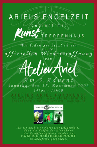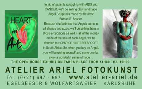 www.britshospice.co.za "One of the secrets of life is that all that is really worth the doing is what we do for others." ~ Lewis Carroll December 2006 Dear Family, Friends and Art Lovers, I am delighted to announce that we will be having a big Re-Opening Exhibition on the 17th of December, the 3rd Advent. As many of you already know, my fotostudio is called Atelier Ariel, like the Angel... It was my childhood dream to restart my greatgrand-father's Film Production Company ARIEL FILMS. My artist's soul and that of my great grandfather's have something in common - the conviction that Art must function for mankind, to help them and create something pure and righteous... I have had the idea of "Heart in Art" for many years and now, after a sad but strengthening tragedy, am conviced that the time has come to create a new beginning. The beginning I envisioned was the KUNST IM TREPPENHAUS Exhibition as the official start for "Heart in Art"... "The Heart" on this occasion, was aimed at the HOSPICE in Hartebeespoort, Brits. This branch of HOSPICE would have nursed my dying father, had he had a fair chance against Pancreatic Cancer. Half of the income was donated to this little HOSPICE branch that struggles tocreate miracles... My grandfather, Friedrich Harry Piel, loved Albert Schweitzer. They were very similar in many vital aspects: they both had a tremendous respect for LIFE, faught for their ideals and for the "Menschheit". Yesterday I came across an expression from Albert Schweitzer: "Viel Kälte ist unter den Menschen, weil wir nicht wagen, uns so herzlich zu geben, wie wir sind." In essence, to me, this means that there is much coldness, awkwardness, life unlived amongst human beings, because they do not dare to live out their hearts, or the warmth that lives within them... I love the expression, because it reminds me of my childhood in Africa, and the magnificent African Souls I met who lived life like Schweitzer believed, and I am convinced that ONLY AFRICA could have inspired him to think like that! The human beings I met gave me enough warmth to open my heart, and showed me how to " live it open... " They were like Angels without wings, because they were messengers of love. They helped me become the Mensch I am today, and I am very grateful of having the priviledge of their guidance. Fortunately, Africa was not the only place where I found Angels... I found some in Australia, and I found many more in Europe who have influenced me positively and accompanied me on my journey. With my "Heart in Art" Exhibition, I wish to return and share something to and with the Menschheit... I am excited about the experience I am able to share with you, this tremendous step in my life. I am also pleased to be able to introduce so many special people to one another... Hope to see you all on our event... Sincerely Eureka